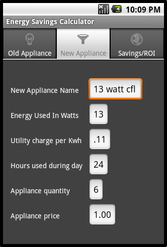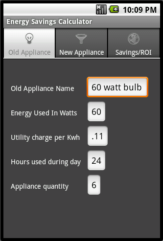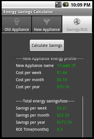 Fill in the fields for both old and new appliances and it will print out a savings summary report with week, month and yearly savings as well as ROI time for money spent on new appliances. Available now in the android market.